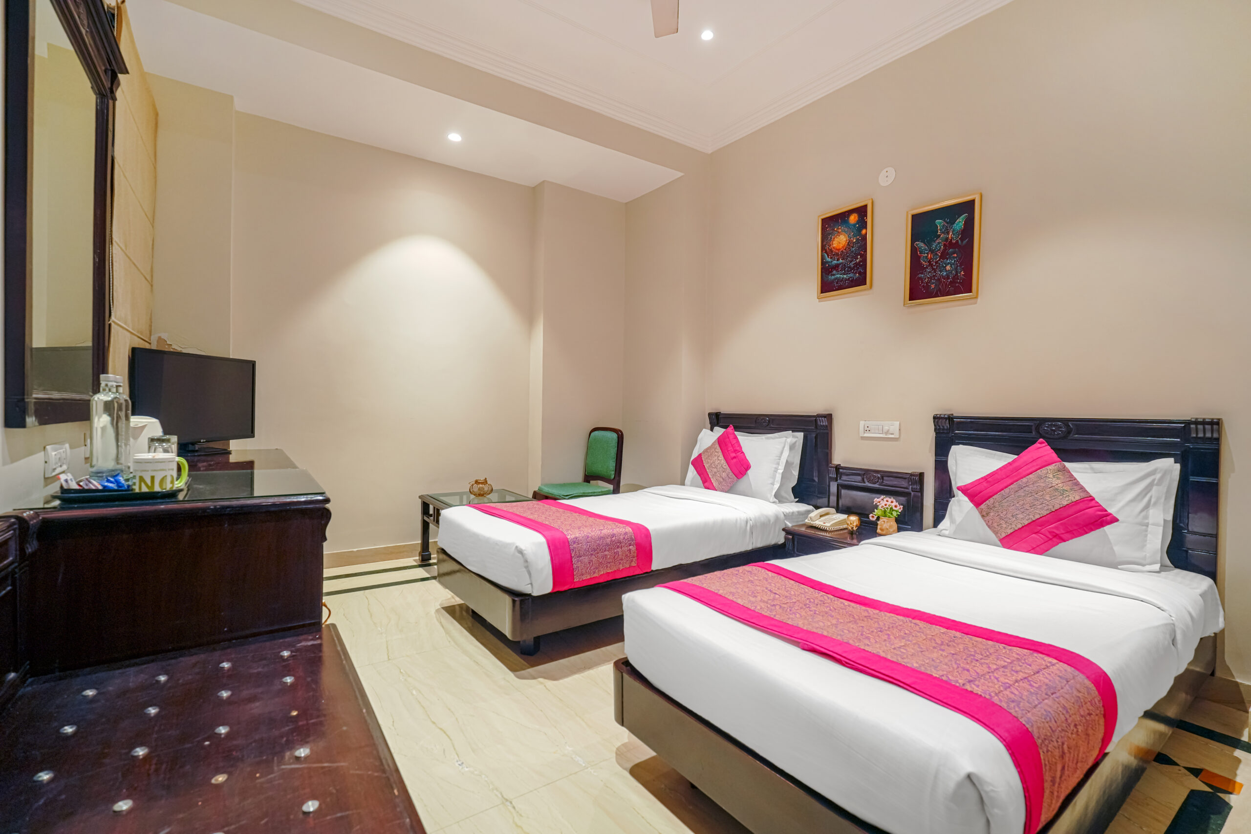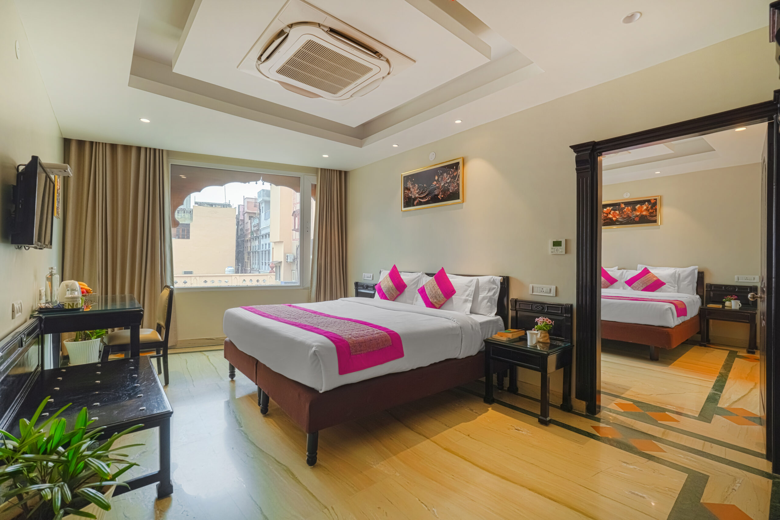 • Family Room (400 sq. ft.) – Ideal for families and groups, offering two large bedrooms with double beds and attached bathrooms for privacy and comfort.