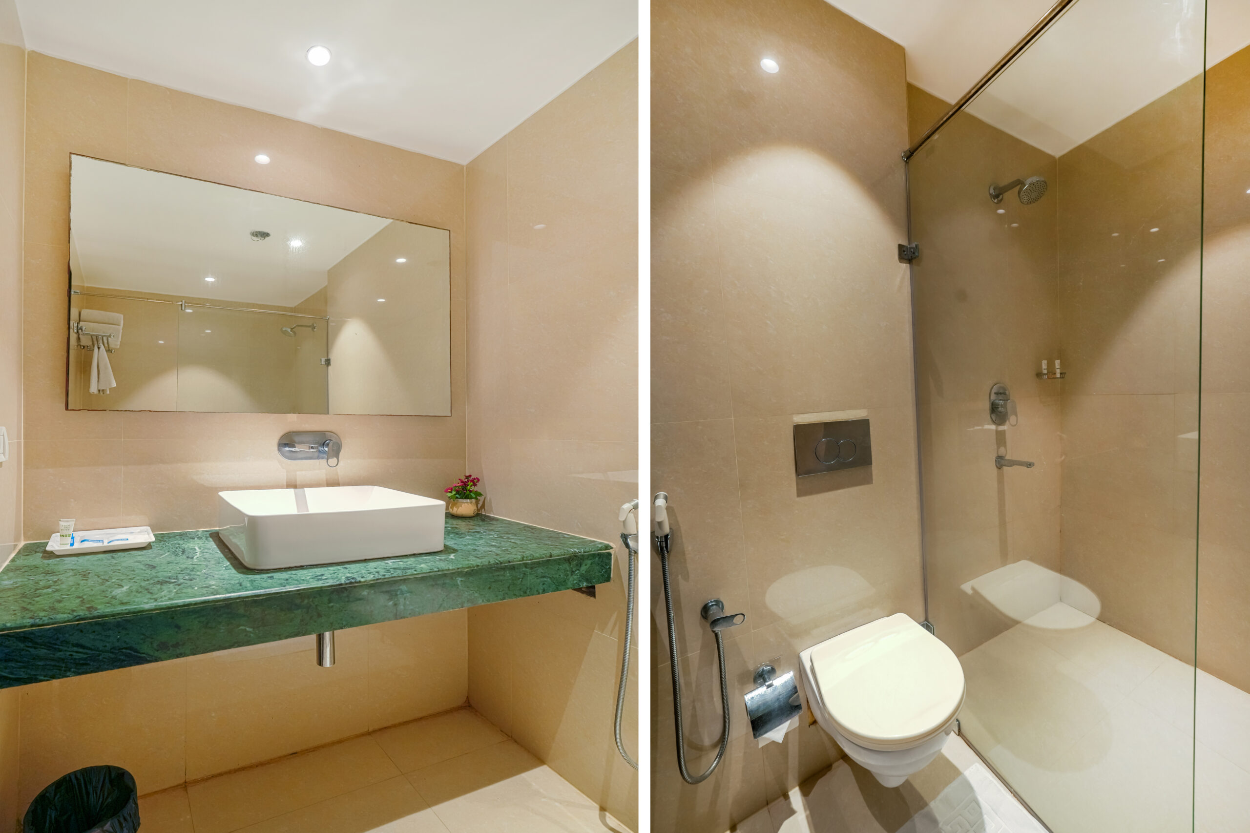 • Queen Room (170 sq. ft.) – Elegantly styled with modern interiors and equipped with a queen-size bed, designed for relaxation and efficiency.